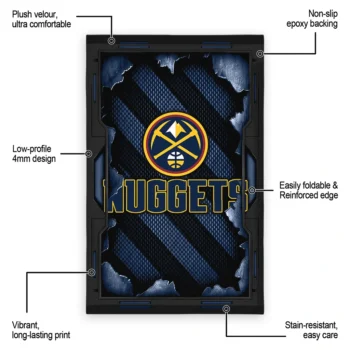 Bring the energy of the court to your home with the Denver Nuggets Rug – Torn Mesh Blue from NBA Fan Market. This rug features a soft velour top and a stable, stay-flat base to prevent slipping.